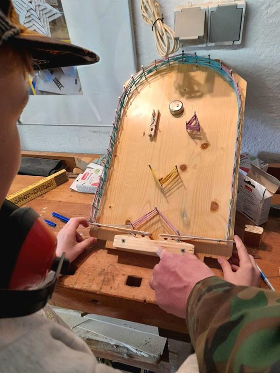 Wir bauen einen einfachen, gut funktionierenden Flipper aus Holz. Wir zeichnen an, nageln, schrauben, leimen, spannen, fädeln.